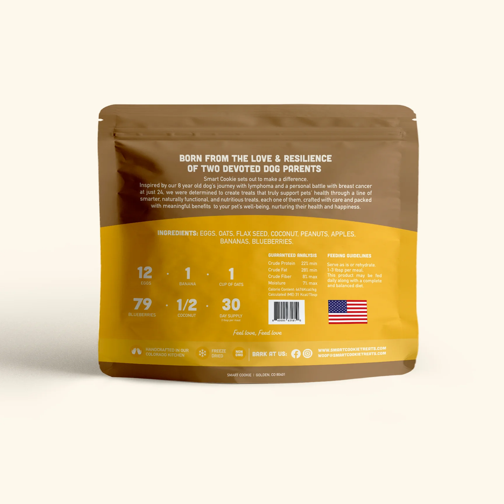 Made with eggs, oats, banana, and blueberries, this breakfast dog food topper delivers protein, fiber, and flavor to start your pup’s day right. The crumbly texture clings to dry or wet food and is perfect for picky eaters or dogs needing a nutrition boost. Serve dry or rehydrated—crafted with limited ingredients and handcrafted in Colorado as an easy, delicious way to upgrade their bowl.