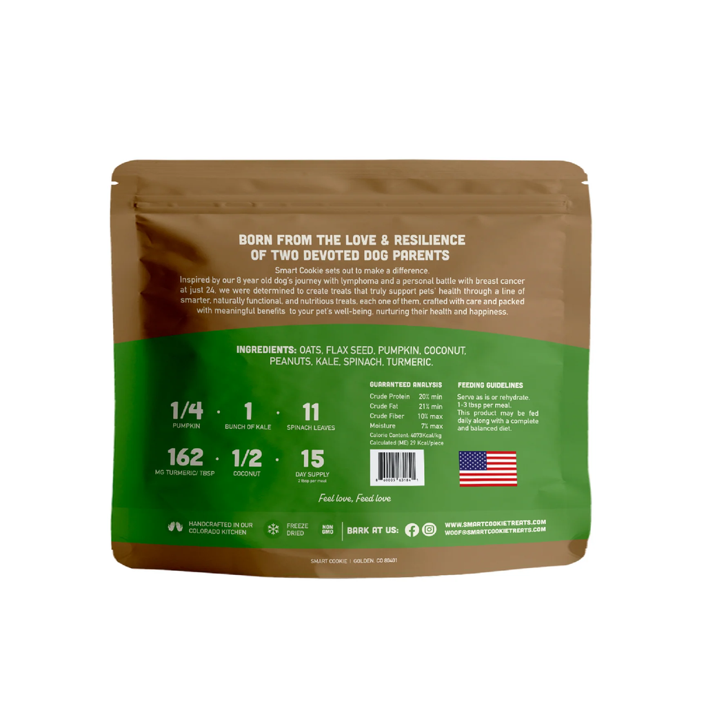 Made with pumpkin, kale, spinach, and turmeric, this vegetarian dog food topper adds a natural boost of nutrients and flavor. The crumbly texture clings to kibble or wet food and can be served dry or rehydrated. Crafted with limited ingredients and handcrafted in Colorado, it’s a clean, easy upgrade to every bowl.