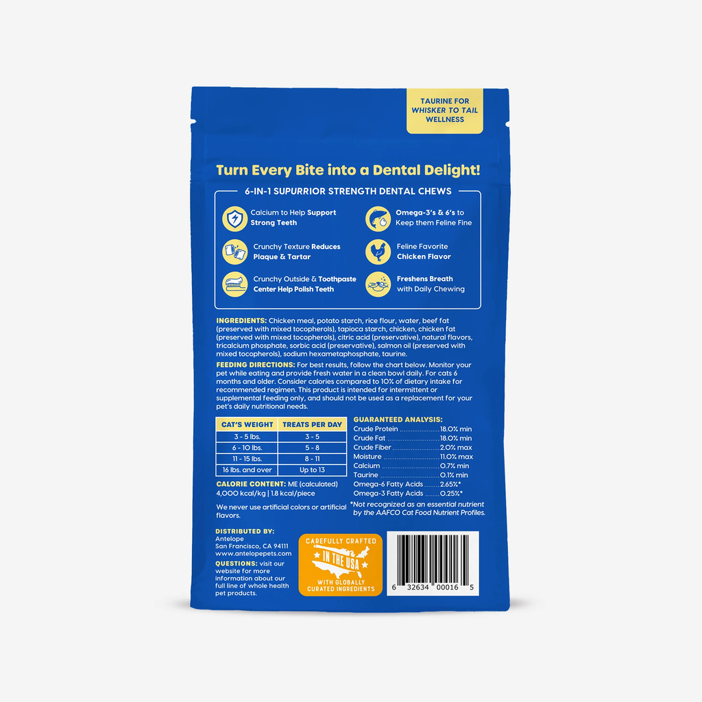 Boost your cat’s dental routine with our 4-in-one crunchy dental cat chews! Each chew is made with a toothpaste center for cleaning and ridges to reduce plaque and tartar. Plus – it is fortified with calcium for extra strengthening!