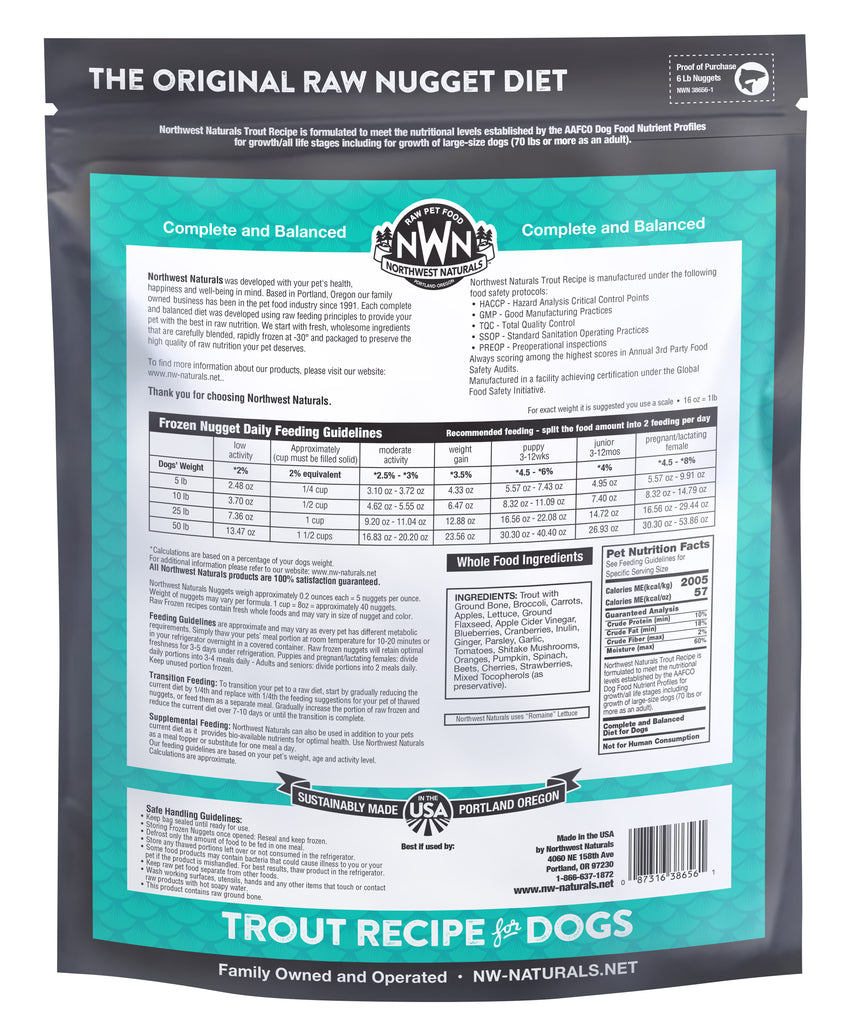 Trout with Ground Bone, Broccoli, Carrots, Apples, Lettuce, Ground Flaxseed, Apple Cider Vinegar, Blueberry, Cranberry, Inulin, Dried Kelp, Potassium Chloride, Sodium Chloride, Ginger, Parsley, Garlic, Zinc Proteinate, Iron Proteinate, Vitamin E Supplement, Copper Proteinate, Manganese Proteinate, Mixed Tocopherols (as preservative), Vitamin D Supplement