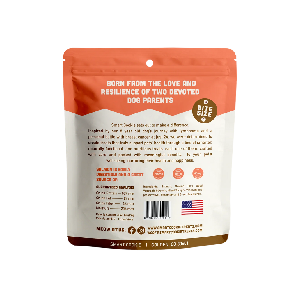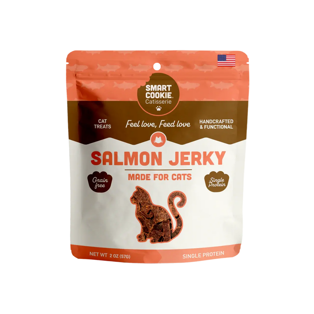 Real salmon plus flaxseed delivers delicious protein with Omega-3s to help support healthy skin and a glossy coat. The soft jerky pieces are perfectly cat-sized for treating or topping. No artificial ingredients, handcrafted in the USA