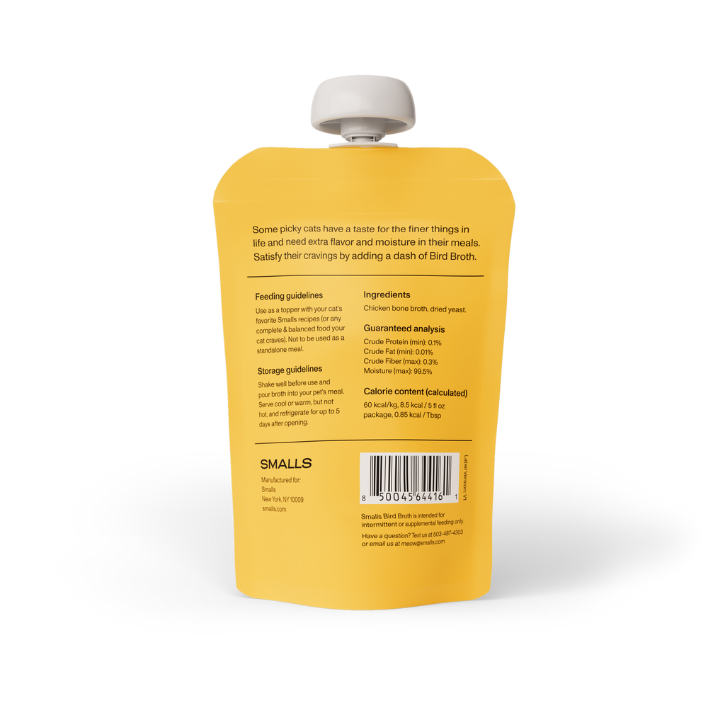 Some picky cats have a taste for the finer things in life and need extra flavor and moisture in their meals. Add a dash of Smalls Bird Broth to your cat’s next meal, and they’ll be lapping up their bowl in no time.