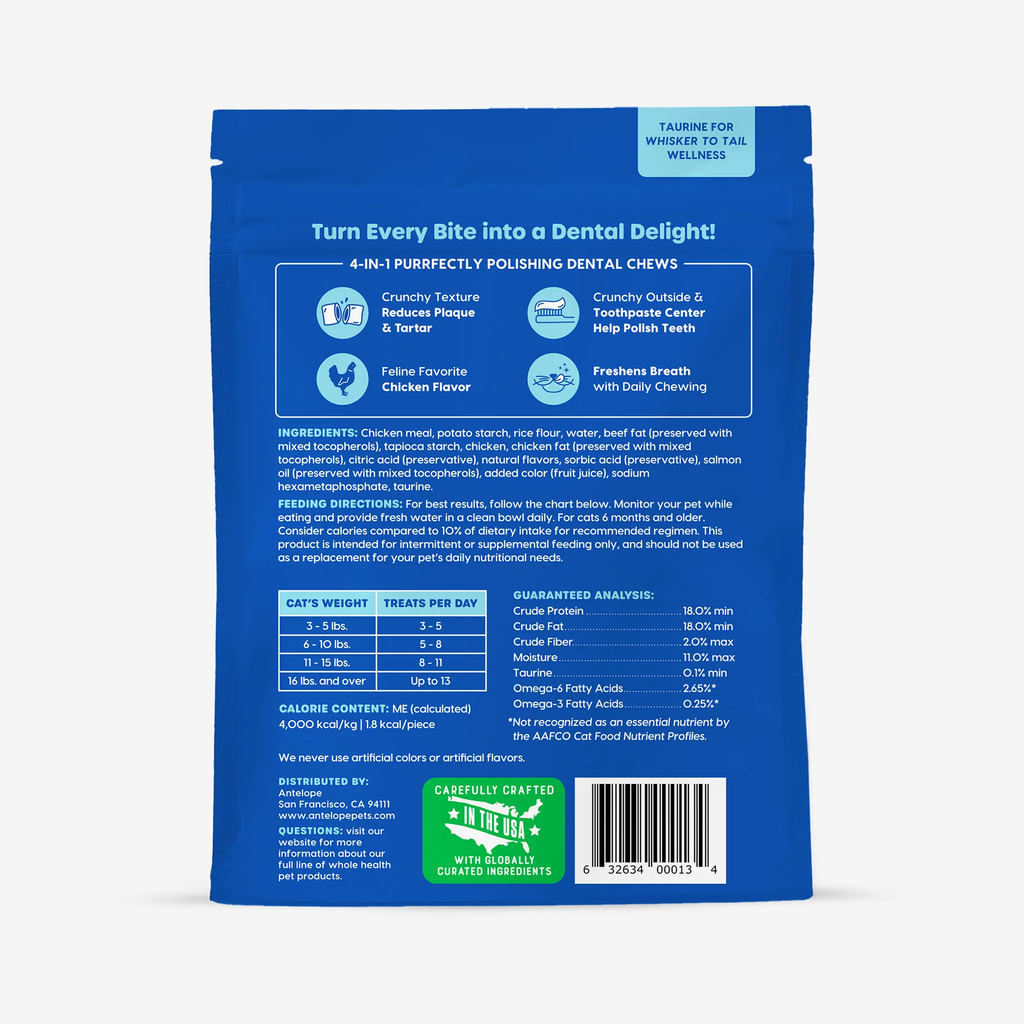 Meet our 4-in-one dental cat chews! Each chew is made with a toothpaste center for cleaning and a crunchy texture to help reduce plaque and tartar. Plus – we have two flavor options (chicken & tuna!) for even the pickiest of cats!