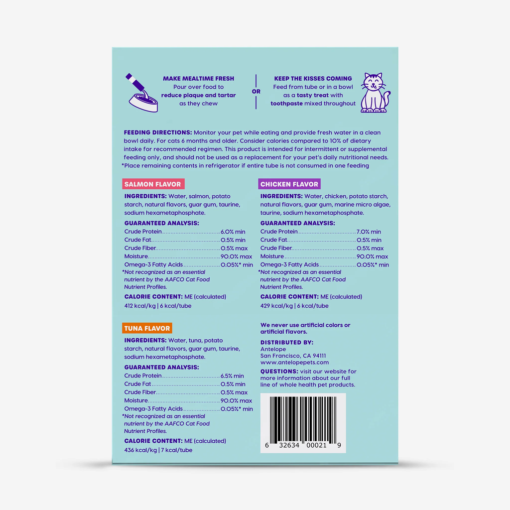 Meet our newest most indulgent approach to dental care – Lickables! These delicious lickable cat treats help to prevent the formation of plaque and tartar on the teeth. Plus – we have 3 tasty flavors your cat will love!