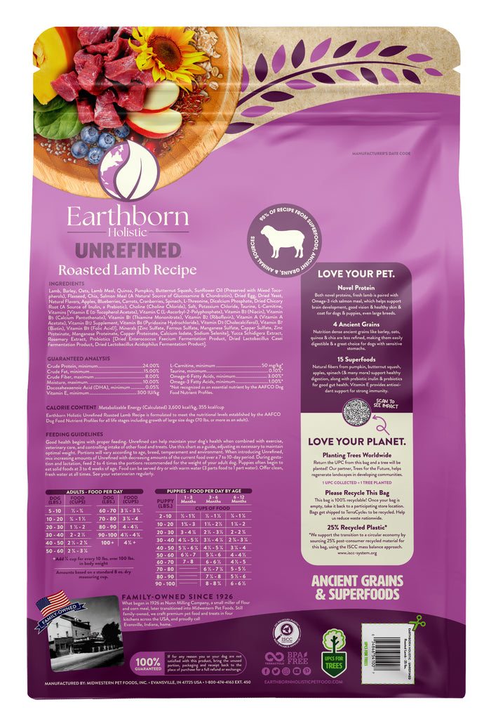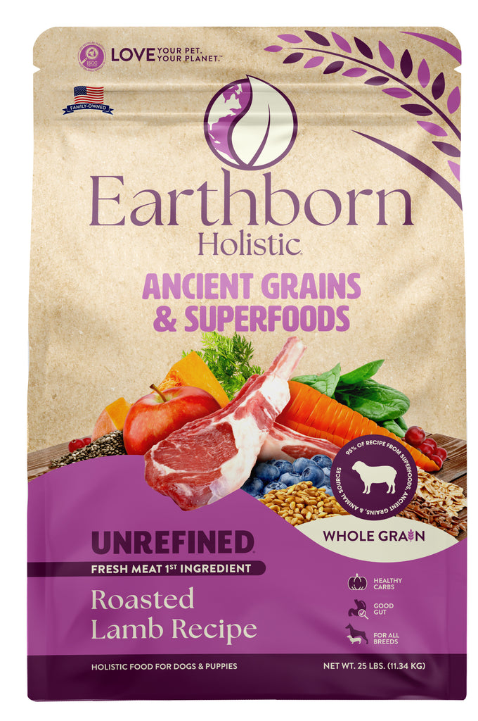 Earthborn Holistic Unrefined Roasted Lamb Recipe is formulated to meet the nutritional levels established by the AAFCO Dog Food Nutrient Profiles for all life stages including growth of large size dogs (70 lbs. or more as an adult).