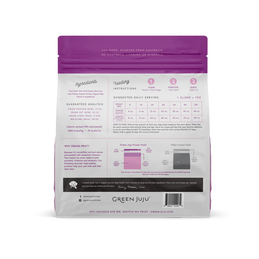 Ingredients: Goat heart, goat (with bone), goat liver, goat kidney, organic parsley, organic kelp, vitamin E supplement.